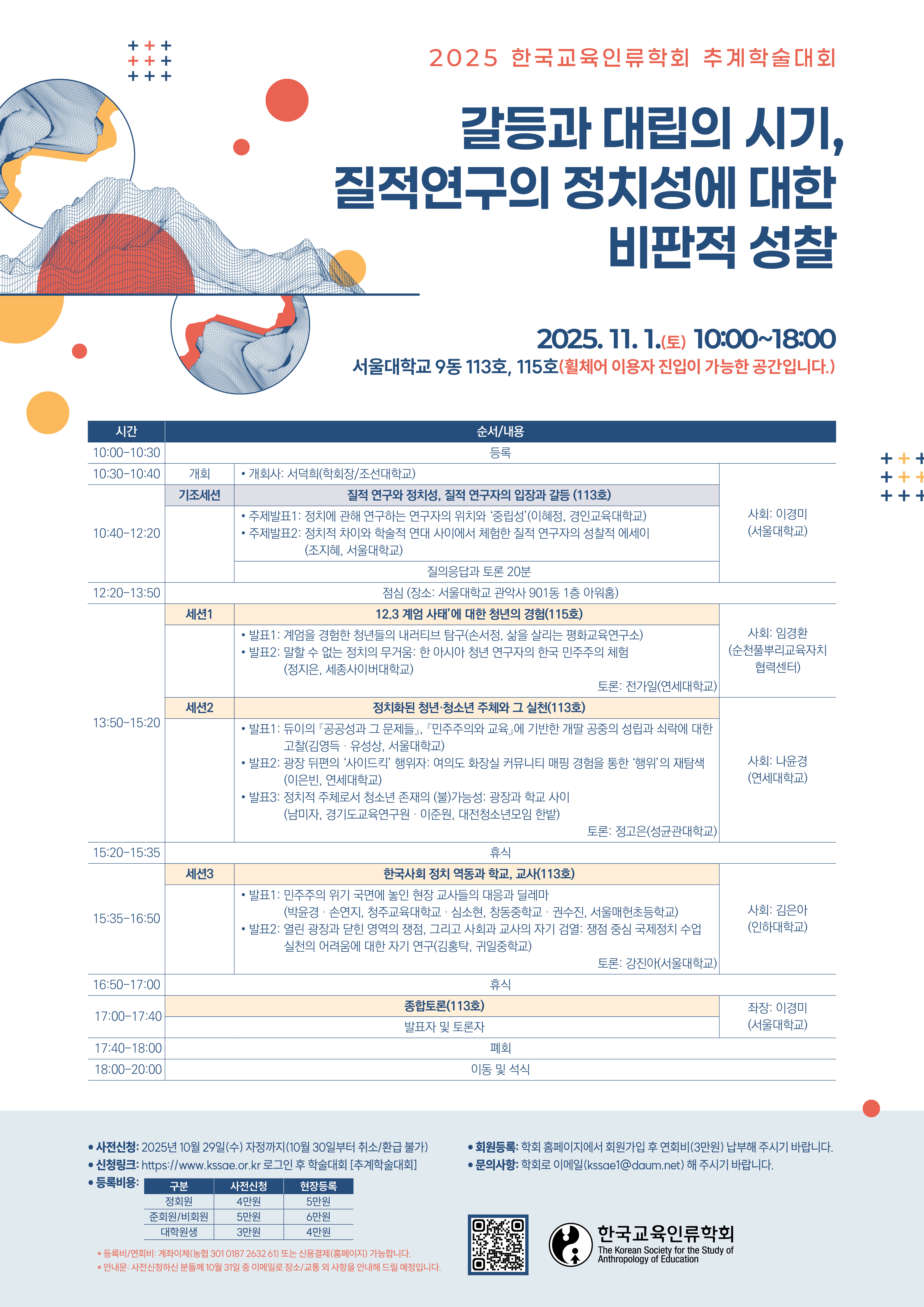 안녕하세요, 한국교육인류학회 2025년 추계 학술대회에 회원 여러분을 초대합니다.