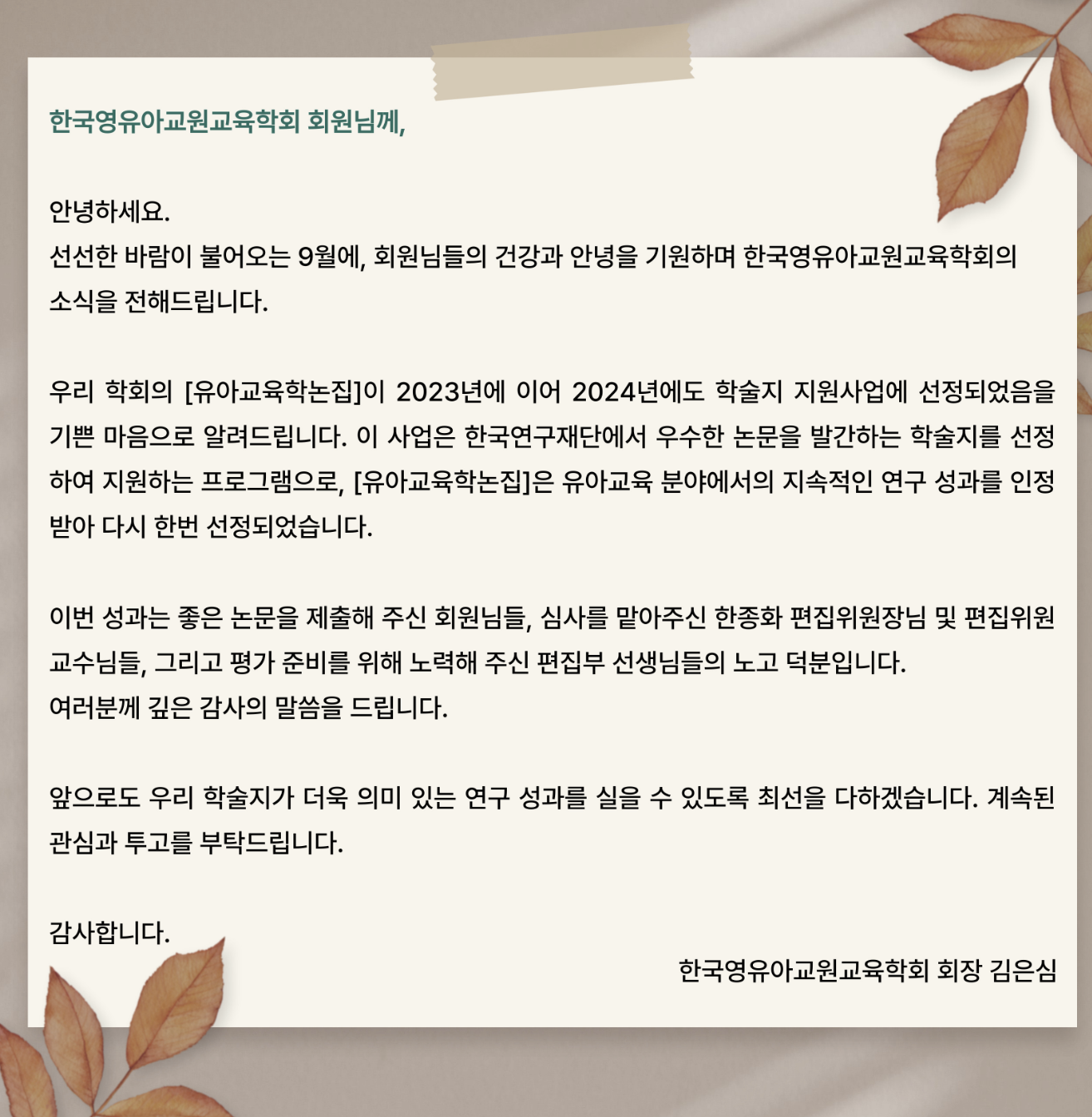 [한국영유아교원교육학회]2024년도 한국연구재단 학술지 지원사업 신규 과제 최종 선정