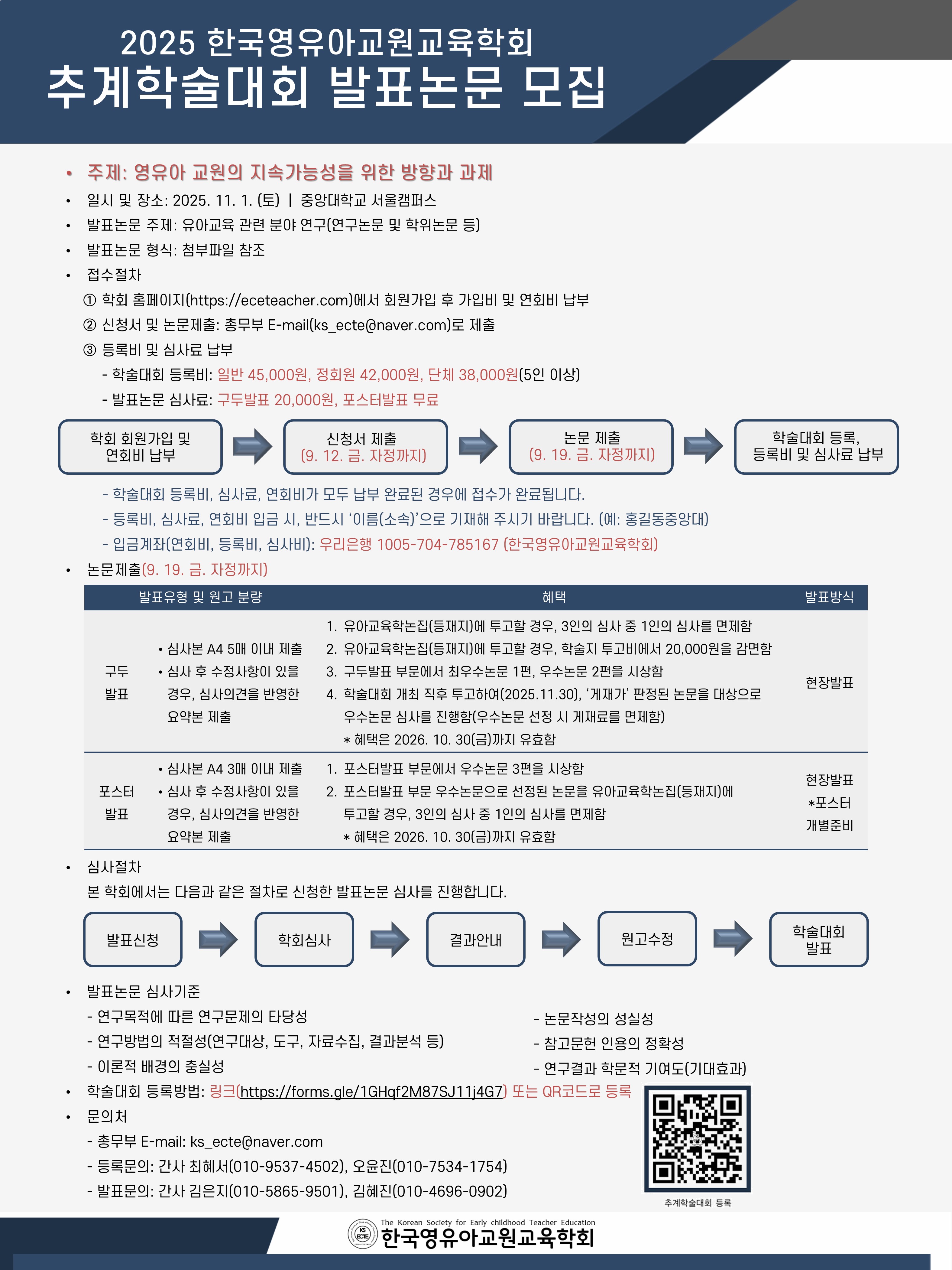 [한국영유아교원교육학회] 2025 추계학술대회 발표논문 모집 안내드립니다.(2025년 11월 1일 토요일)