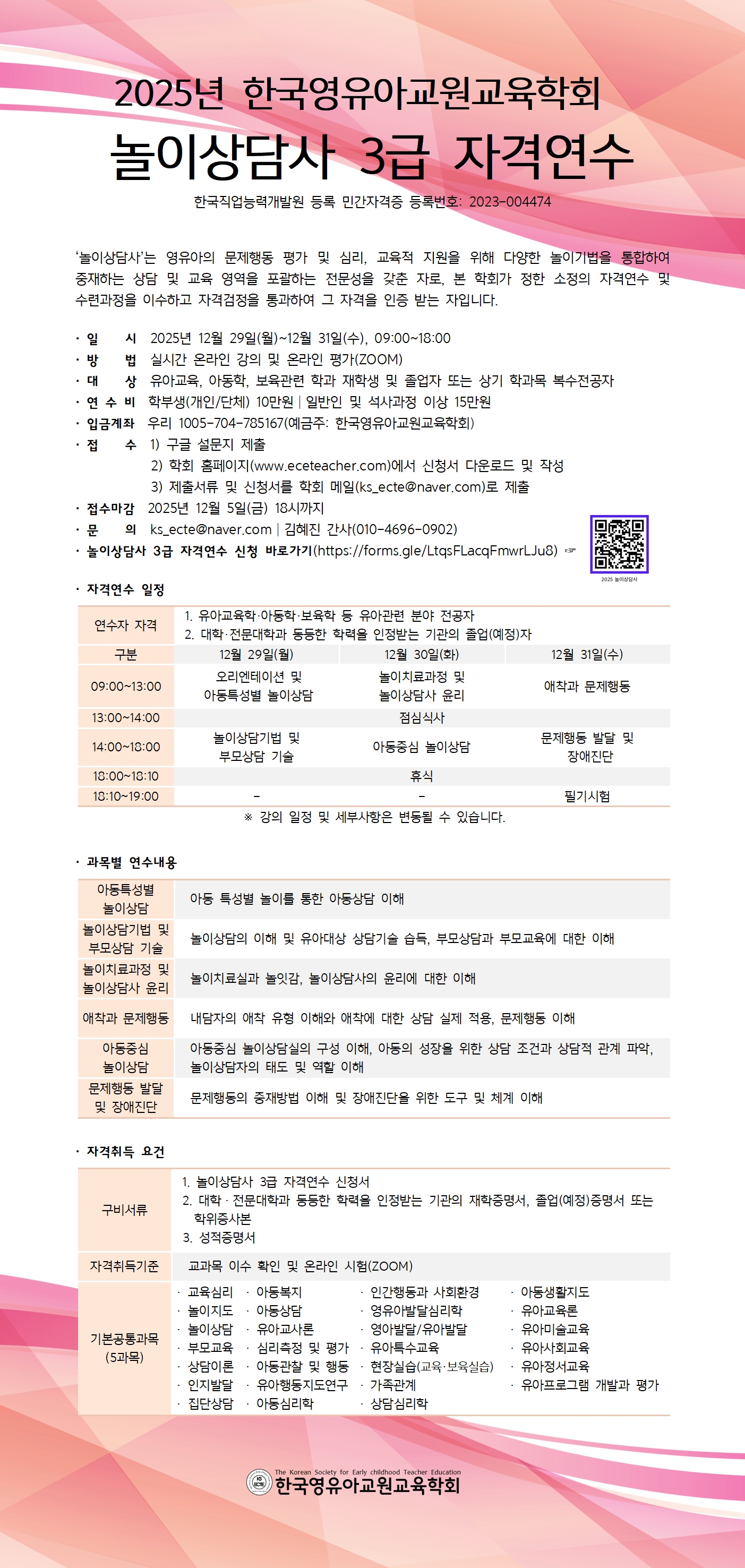 [한국영유아교원교육학회]2025년 놀이상담사 3급 자격연수(2025년 12월 29일 월요일~12월 31일 수요일)